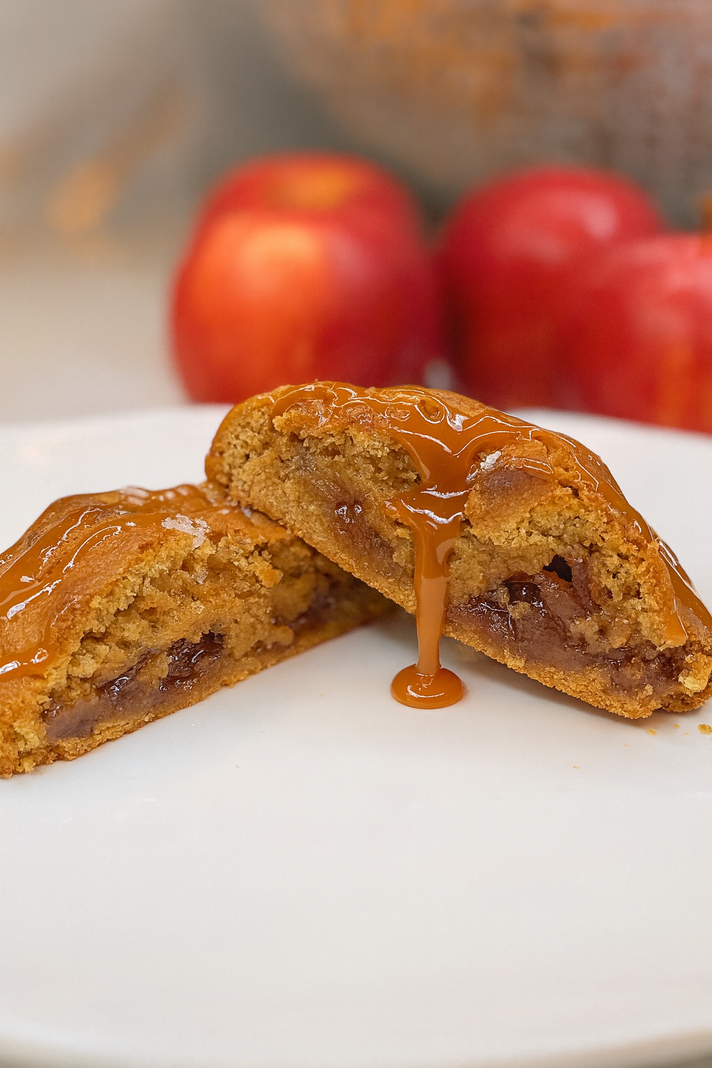 This indulgent cookie starts with a soft, cinnamon-spiced base and is stuffed with our fresh homemade apple filling. Each cookie is finished with a drizzle of rich caramel and a sprinkle of chopped pecans for the perfect balance of cozy comfort and sweet crunch. Like a slice of warm apple pie, reimagined as a cookie.