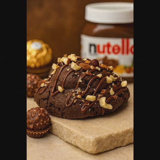 Decadence overload ! A rich chocolate cookie oozing with Nutella and crowned with a Ferrero Rocher