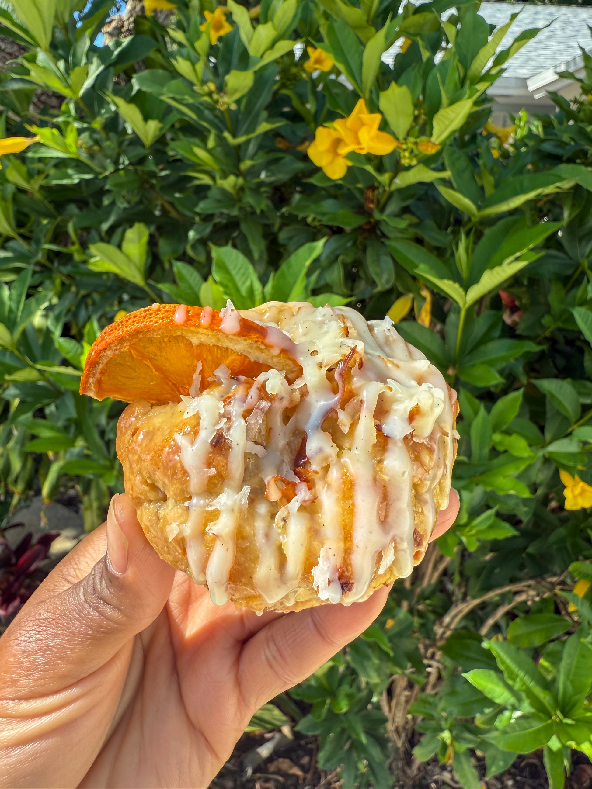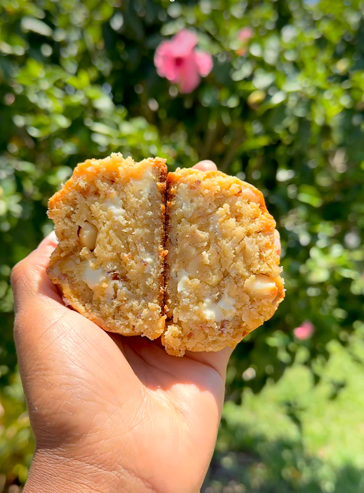 This tropical treat is packed with creamy white chocolate chunks, crunchy roasted macadamia nuts, and golden toasted coconut—all wrapped up in our signature cookie dough. We top it off with a dreamy white chocolate orange ganache and a sprinkle of toasted coconut for that perfect island finish. One bite and you’re on vacation! 🌴🍊🍪